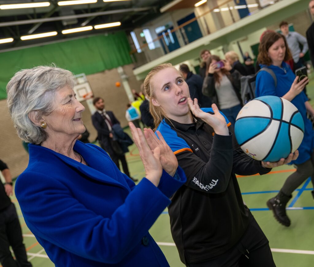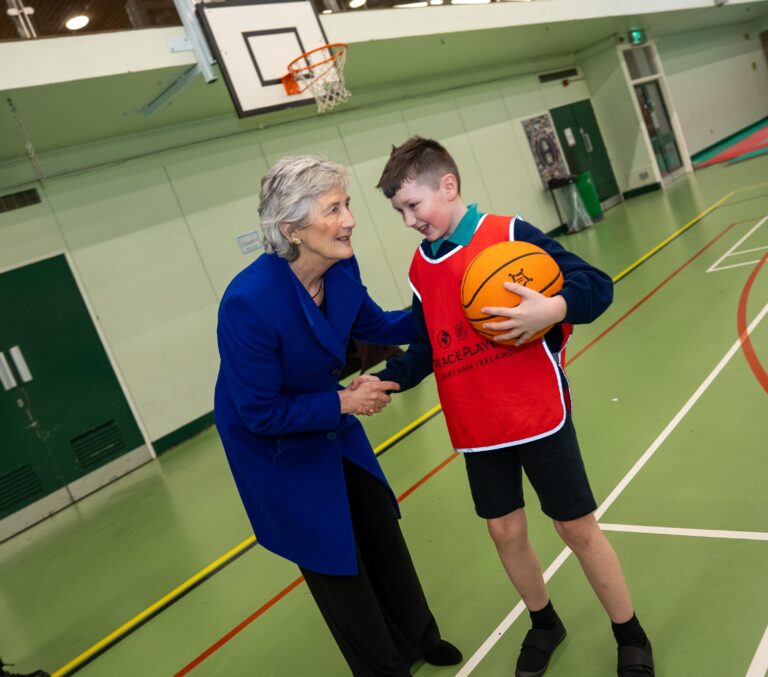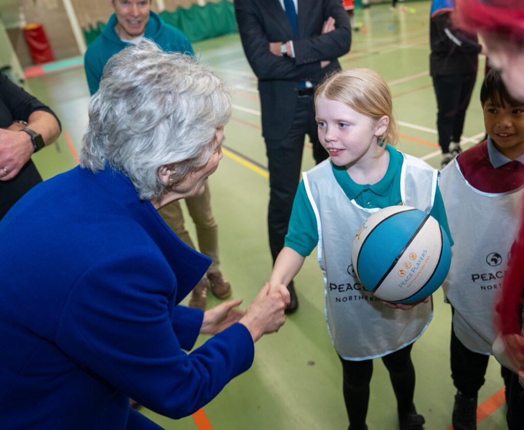 President Connolly got on the court with over 100 primary school children at Passports Ready!, a sports for reconciliation activity delivered by PeacePlayers Northern Ireland as part of the 4 Corners Festival. 4 Corners Festival is a cultural celebration dedicated to further uniting a community that, even almost 30 years following the Good Friday Agreement, still experiences the aftermath of conflict. Passports Ready! was a fitting addition to the 4 Corners roster, bringing together children from across Belfast to play, learn and build relationships through sport. Passports Ready! was about journeys. Every young person’s journey is different, but when those journeys cross — through teamwork and shared experiences — learning and understanding grow.